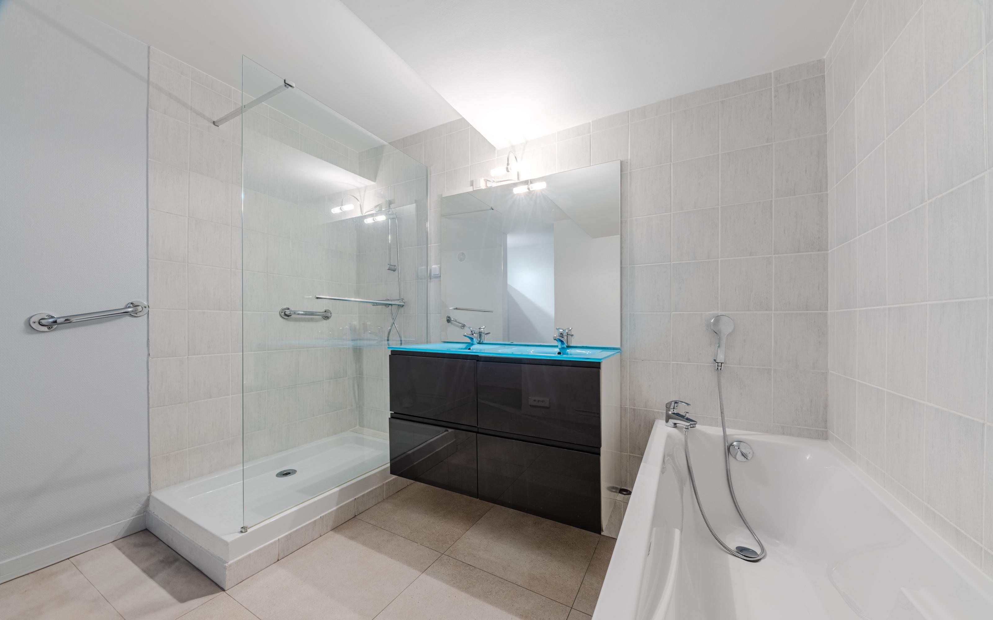 - Salle de bains moderne : Une salle de bains élégante avec douche et baignoire pour votre confort.